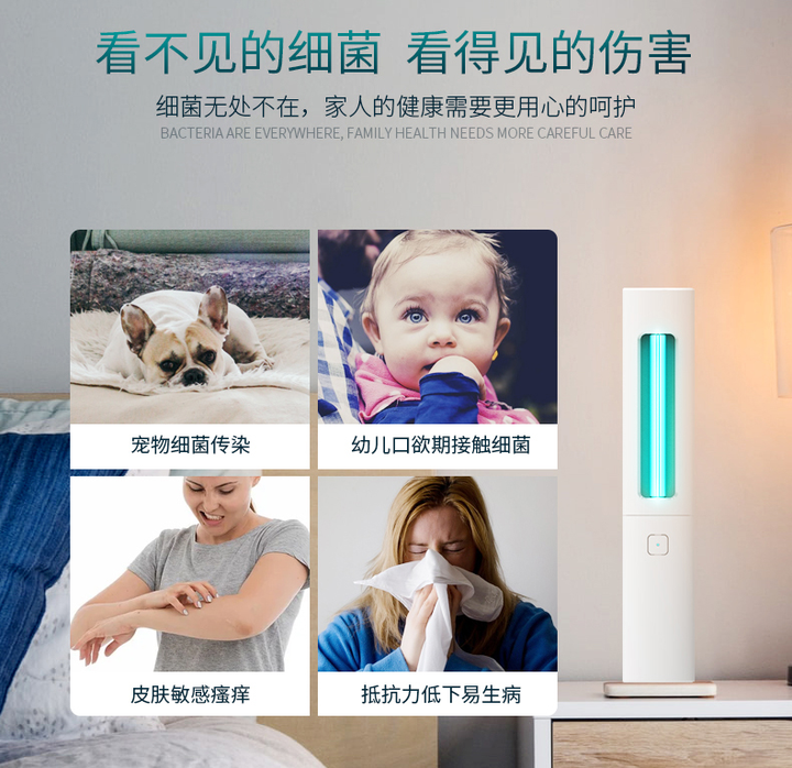 也许有人会觉得讲的太严重,危言耸听或是过于讲究等都行,但是我们一定要有这样的意识,细菌是无处不在的,家人的健康要更用心的呵护!因此,通过消毒杀死这些危害人体的细菌或病毒,是防止感染、保持身体健康的重要工作!传统消毒方法过程繁琐复杂,比如孩子的用品放点热水拿热毛巾擦、用开水烫玩具,但你还得考虑并不是所有玩具都可以用开水消毒的。当然,市面上还会有很多消毒剂,擦完再喷一喷,或者用带有消毒作用的清洗剂浸泡两三分钟的时间再进行清洗,整个弄下来你会觉得,好累啊!在家居消毒时,也无法顾及每个角落,容易造成二次污染。眼下,疫情又有反扑趋势,虽然肯定不可能再想去年那样紧张,但是我们居家防疫、外出防护也是非常必要的!早在国家卫健委印发的《新型冠状病毒感染的肺炎诊疗方案(试行第五版)》中提到病毒对紫外线和热敏感,出门回家时的衣物、家居用品、宠物用品等都可以通过紫外线消毒进行杀菌,可以一定程度消灭病毒。所以,目前最好的杀菌消毒方式就是采用紫外线灯进行!